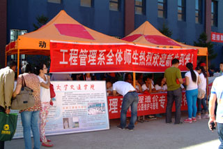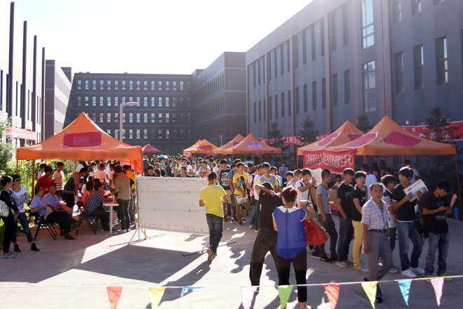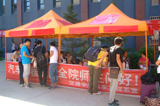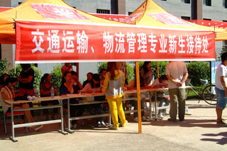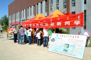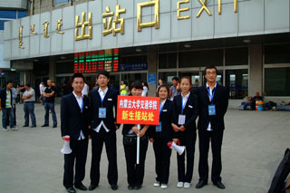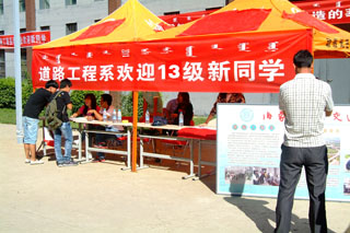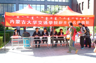 2013年8月23日,內(nèi)蒙古大學(xué)交通學(xué)院彩旗飄揚(yáng),迎新標(biāo)語、報(bào)到示意圖和導(dǎo)引牌以及工作在迎新各崗位的老師、同學(xué)一齊營造出濃濃的迎新氛圍。來自各地的2013級新同學(xué)開始陸續(xù)到校報(bào)到。