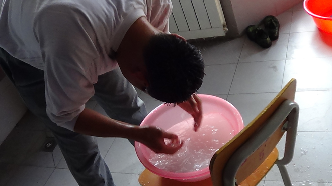 一等獎(jiǎng) 作品名稱:一水多用 作品簡介:現(xiàn)在水資源嚴(yán)重短缺,我們應(yīng)該學(xué)會(huì)節(jié)約用水,最實(shí)用簡單的方法就是一水多用,這組照片是一個(gè)男生在宿舍的用水情況,他用一盆水洗頭,洗拖布打掃宿舍,最后才將一盆水倒掉。我們應(yīng)該向他學(xué)習(xí),學(xué)會(huì)一水多用。 土木1302班 楊蕓蕓 |